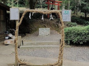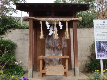 城山公園の一角に建立され、その御柱の先端部分が町の入口の道路脇に祀られていました。