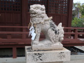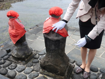 紙垂(しで)を貼った石を祀る注連縄、壱岐の伝説の一つである百合若大臣の鬼退治の像、