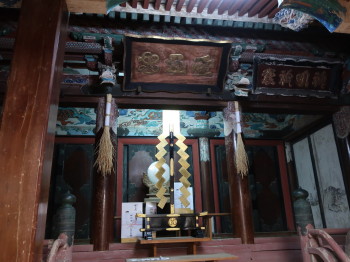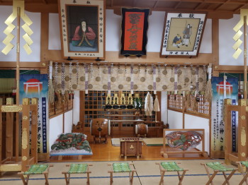 普通には見ることができない鏡、幣束、御神酒、衛士・狛犬などが置かれ、