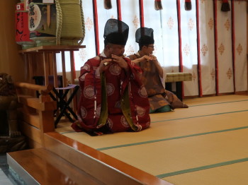 17時頃から儀式殿で約700年の古い伝統と歴史をもつ神事芸能「壱岐神楽」を鑑賞しました。