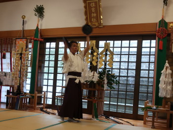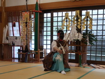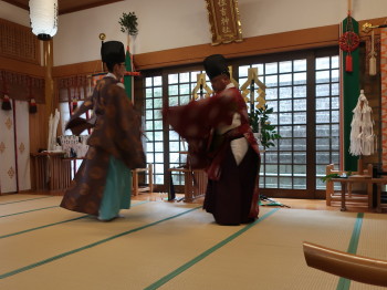壱岐神楽は神楽舞も音楽も現職の神職だけで奏されること、全ての曲目を畳2畳の上で舞うことを特徴とし、