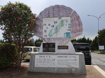 浅茅湾内に多く生息するというヒオウギ貝のモニュメントが歓迎の意を表していました。