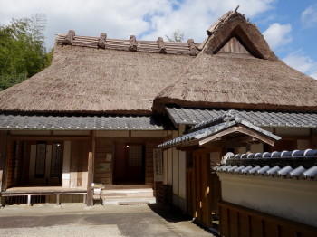 茅葺き屋根、勘定の間、庭に面した式台を持つ庄屋家独特の肘屋建築様式の30坪の母屋が、