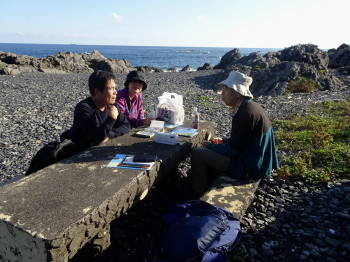 海岸へ降りて、国の天然記念物に指定されている亜熱帯植物アコウを見た後、3時のおやつタイムとなりました。