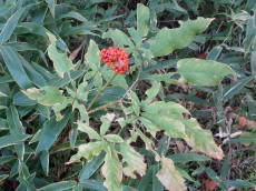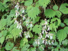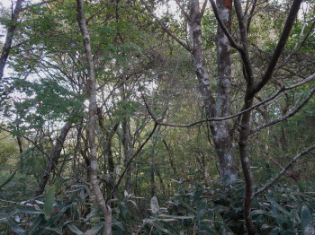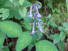 姫鶴平を抜けて、土佐と伊予との境目番所のひとつ「唐岩番所跡」の標識などを見ながら、 ブナを中心とした原生林の山道を下って行きました。 ジンジソウ アキチョウジ マムシグサ 一瞬、今頃ユキノシタの花?と見間違えたジンジソウの大群落やシロヨメナ、ツリフネソウなど 秋の花が車道脇にひっそりと咲いていました。