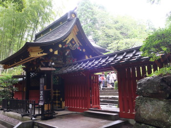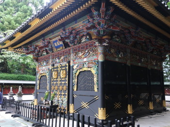 権現造りの霊廟建築は、神殿内外とも黒漆塗り、長押より上には極彩色の彫刻が施され、
