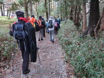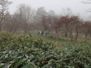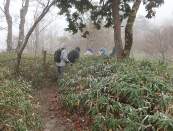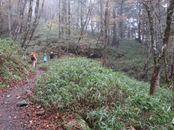 「コケ類が衰退して、ミヤコザサが繁茂した」など、時々、立ち止まってガイドさんのお話を聞く私達の横を