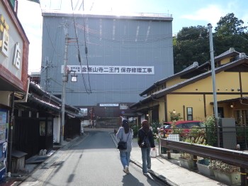 以前、前を見て下った時には目に入らず、素通りしてしまった金峯山寺二王門の保存修理工事が正面に現われ、