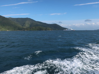 しばらく船を進め、左手に焼火山(452m)や宿泊した「リゾ隠岐ロザージュ」、海上保安庁の巡視艇が見え、