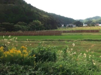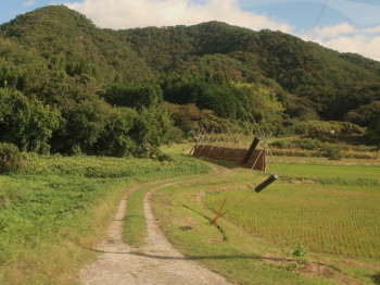 刈り取った稲を稲木にかける秋の田んぼ風景、はざかけを車窓にしながら、