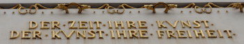 「それぞれの時代にそれぞれの芸術を 芸術には自由を」の金文字、メドゥーサ、トカゲ、フクロウ、カメのレリーフや彫刻など、
